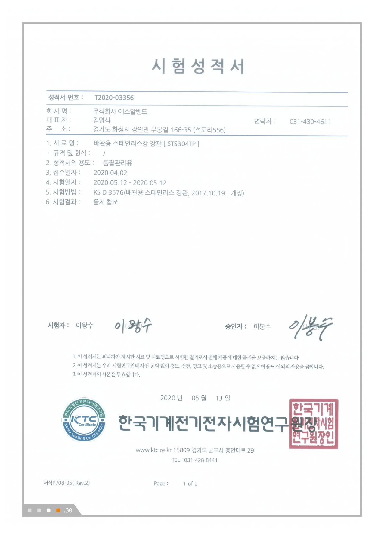 배관용 스테인리스강 강관 시험성적서