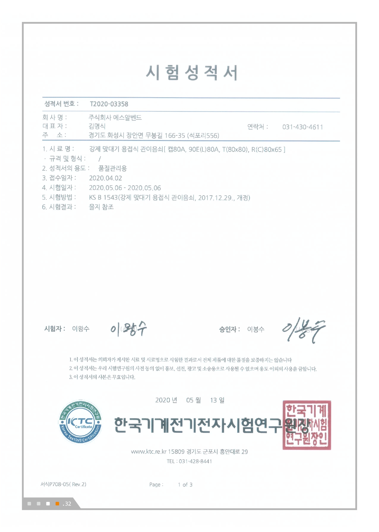 (제 KTC 2016-0137호 KS B 1543) -